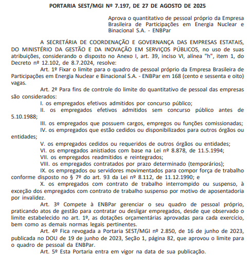 Nesta quinta-feira (28/8), foi publicada em Diário Oficial da União portaria que aprova o novo quantitativo de servidores da empresa. Conforme o documento, o limite máximo para o quadro de pessoal próprio da ENBPar passa a ser de 168 vagas.