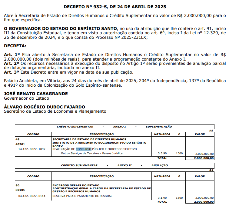 O edital do novo concurso IASES (Instituto de Atendimento Socioeducativo do Espírito Santo) é aguardado com expectativa, e o governo do estado liberou crédito suplementar para a realização do certame!