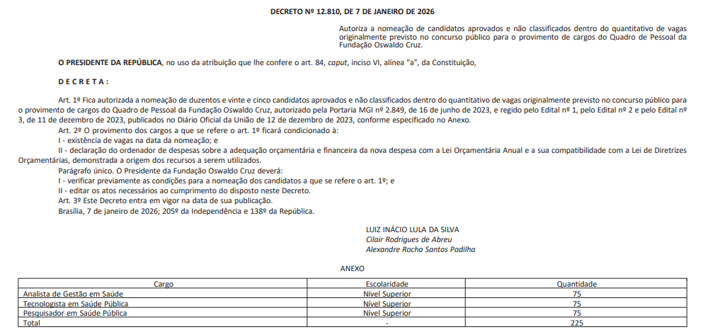 O Governo Federal autorizou, na última quarta-feira (7/1), a nomeação de 225 pessoas aprovadas no concurso público da Fundação Oswaldo Cruz (Fiocruz) que não haviam sido classificadas dentro do número original de vagas.