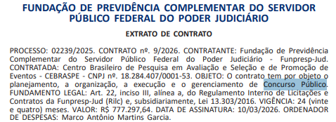 Isso porque foi publicado nesta quarta-feira (18/3) no Diário Oficial da União (DOU) o extrato de contrato que define o Centro Brasileiro de Pesquisa em Avaliação e Seleção e de Promoção de Eventos (Cebraspe) como banca organizadora do certame.