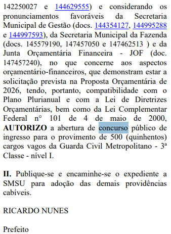 Esta é a primeira etapa de um processo mais amplo, que inclui também a abertura de novo concurso público para a GCM. A Prefeitura já iniciou os trâmites administrativos e autorizou, em novembro, a contratação direta da Fundação Vunesp como organizadora do certame.
