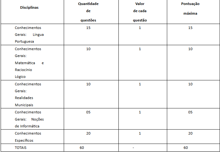 A prova objetiva será composta de 60 questões de múltipla escolha, com 5 alternativas cada uma, sendo considerada apenas 1 alternativa correta. A avaliação tem um total de 60 pontos.