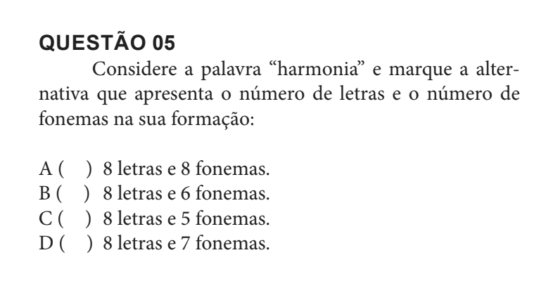A questão 5 da prova de Língua Portuguesa, destinada ao cargo de Auditor Fiscal, pedia o número de letras e fonemas da palavra “harmonia”. A banca apontou como gabarito definitivo a alternativa B — 8 letras e 6 fonemas.