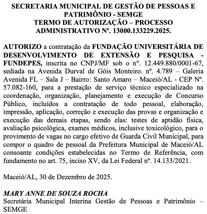 A Prefeitura de Maceió definiu a FUNDEPES/COPEVE como banca organizadora do novo Concurso da Guarda Civil Municipal. A autorização de contratação foi publicada no Diário Oficial do Município desta sexta-feira (2/1).