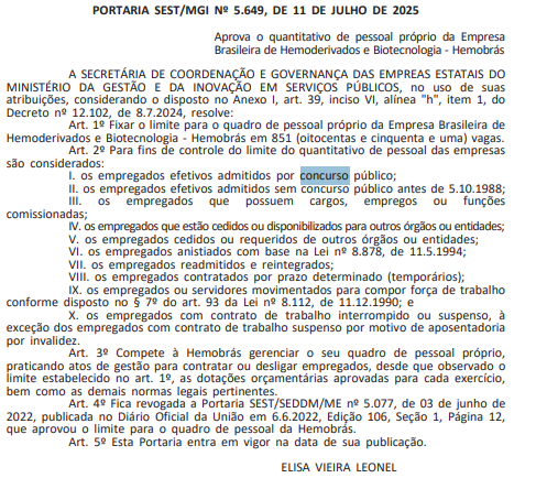 Dessa forma, fica revogada a portaria de junho de 2022 que estabelecia o limite em 362 vagas. Ou seja, houve um aumento de 489 vagas no quadro de pessoal da empresa.