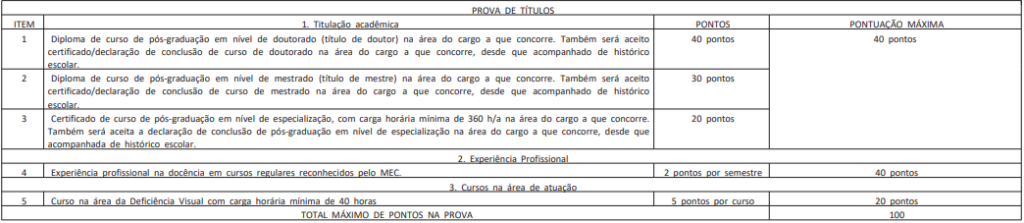 A Prova de Títulos terá valor máximo de 100 (cem) pontos, ainda que a soma dos valores dos títulos e dos comprovantes apresentados seja superior a este valor, conforme disposto a seguir: