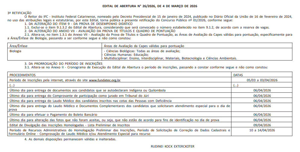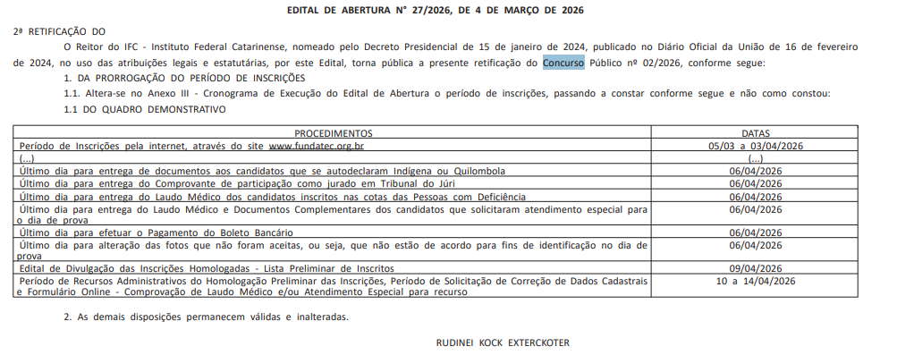 O Instituto Federal Catarinense (IFC) prorrogou as inscrições de seus dois concursos públicos de 2026. Os editais de retificação, publicados em 4 de março de 2026, estenderam o prazo final de 30 de março para 3 de abril de 2026. As inscrições seguem pelo site da banca organizadora Fundatec (www.fundatec.org.br).