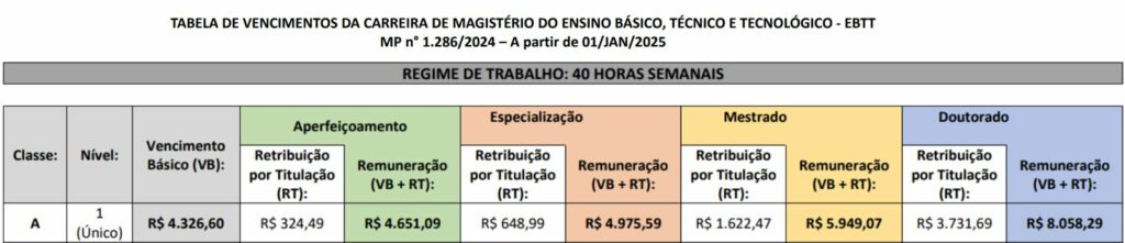 O salário inicial para Magistério/Docentes é de R$ 4.326,60, mas pode chegar a R$ 8.058,29 com especializações, conforme a tabela abaixo: