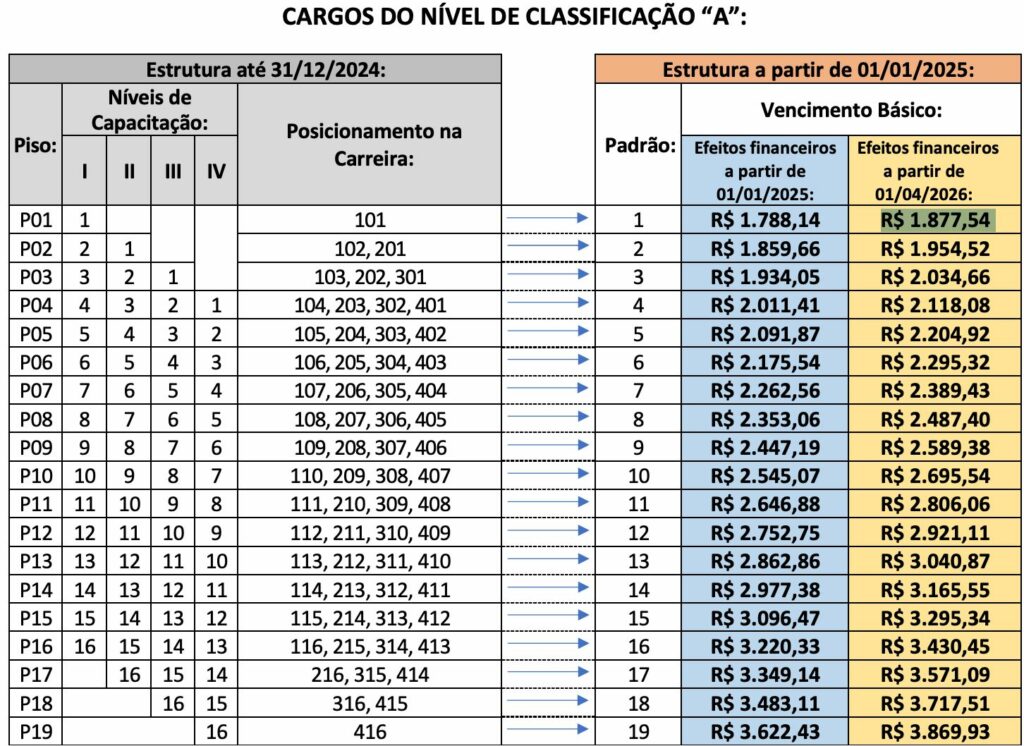 Para Técnicos Administrativos em Educação, o salário inicial é de R$ 1.788,14, mas passa a ser R$ 1.877,54 em abril de 2026. Confira: