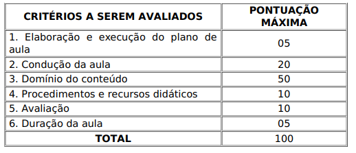 Na Prova de Desempenho Didático serão avaliados os seguintes critérios:
