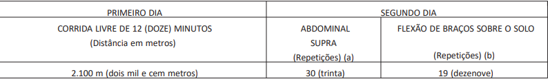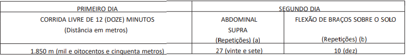 As tarefas serão realizadas em dois dias consecutivos. A Aptidão Física dos candidatos deve ser avaliada obedecendo aos índices mínimos abaixo discriminados: