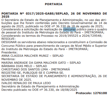 Nesta quinta-feira (11/12), foi publicada em Diário Oficial do estado a Portaria nº 0317/2025-GABS/SEPLAD, que designa os servidores que irão compor uma nova Comissão de Concurso Público.