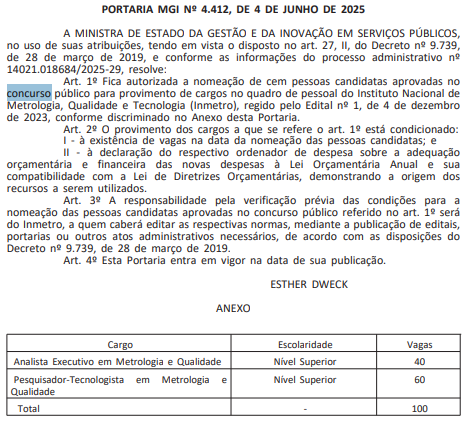 A nomeação dos aprovados no último concurso INMETRO (Instituto Nacional de Metrologia, Normalização e Qualidade Industrial) foi autorizada pelo Ministério da Gestão e Inovação (MGI)!