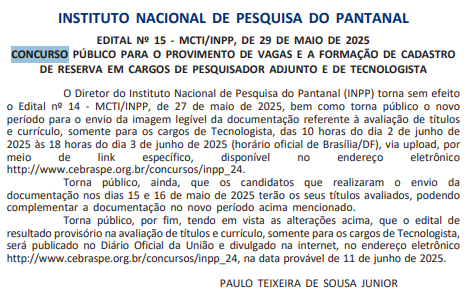 Além disso, estabelece o novo período para o envio da imagem legível da documentação referente à avaliação de títulos e currículo, sendo das 10 horas do dia 2 de junho às 18 horas do dia 3 de junho de 2025, pelo site da banca Cebraspe.