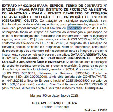 Foi publicado em Diário Oficial do estado na última sexta-feira (5/12), o Extrato de Contrato Nº 622/2025, que formaliza a contratação do Cebraspe para planejar, organizar, executar e processar todo o certame. Segundo o documento, a vigência do contrato encerra em dezembro de 2006.