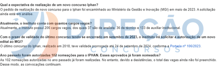 Vale destacar que o certame teve sua validade prorrogada até 24 de setembro de 2024. Veja, abaixo, a resposta do Instituto do Patrimônio Histórico e Artístico e Nacional sobre o concurso Iphan!