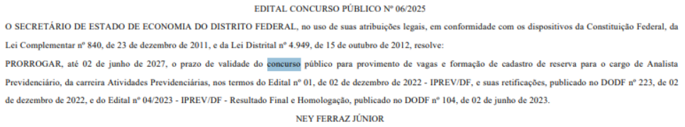 Segundo a portaria assinada pelo Secretário de Economia do DF, Ney Ferraz, o edital terá sua validade prorrogada até o dia 2 de junho de 2027. A prorrogação permite que mais candidatos aprovados sejam convocados.