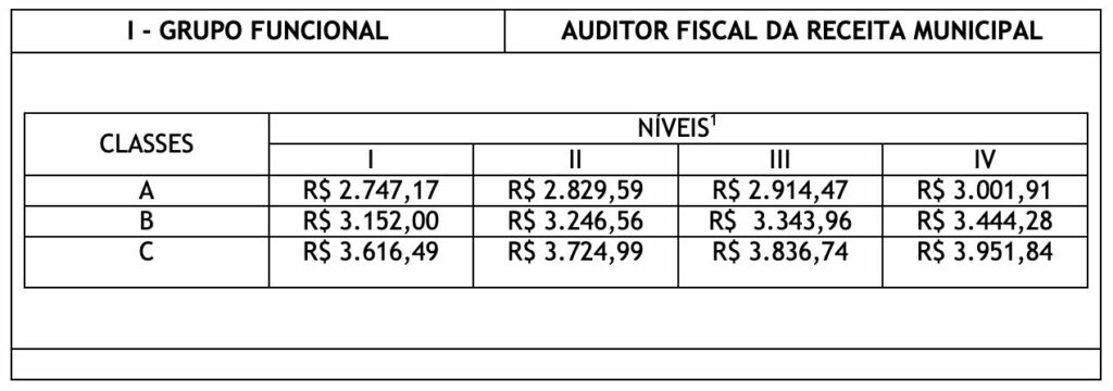 Segundo a Lei Municipal nº 9.154/2015, a estrutura de remuneração do cargo de Auditor Fiscal da Receita Municipal é organizada em três Classes e quatro Níveis.