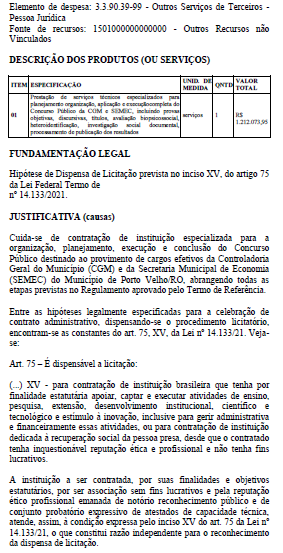 O concurso ISS Porto Velho deu um passo decisivo rumo à sua realização. A Secretaria Municipal de Administração (SEMAD) de Porto Velho (RO) publicou o Termo de Dispensa de Licitação n° 0552541/2026, contratando o Cebraspe como banca organizadora do certame, que contempla vagas para a Controladoria Geral do Município (CGM) e para a Secretaria Municipal de Economia (SEMEC).A contratação do Cebraspe foi fundamentada no inciso XV do artigo 75 da Lei Federal n° 14.133/2021, que permite a dispensa de licitação para instituições brasileiras com finalidade estatutária voltada ao ensino, pesquisa, desenvolvimento institucional, científico e tecnológico. O processo administrativo de referência é o de número 013.000227/2025-72.O valor global do contrato é de R$ 1.312.073,95, custeado com outros recursos não vinculados (fonte 15010000000000), dentro do programa 031 – Gestão de Pessoal e Desenvolvimento Institucional.O Cebraspe (Centro Brasileiro de Pesquisa em Avaliação e Seleção e de Promoção de Eventos) será responsável por todas as etapas do certame, incluindo planejamento, organização, aplicação e correção das provas, além de avaliação biopsicossocial, heteroidentificação e procedimentos sociais, conforme previsto no Termo de Referência.Com a banca definida, os candidatos aguardam a publicação do edital de abertura do concurso ISS Porto Velho. A previsão é de que sejam ofertadas vagas para Auditor de Tributos do Tesouro Municipal (10 diretas e 10 CR) e Assistente de Arrecadação (5 diretas e 5 CR), com salários de até R$ 16 mil.Tenha a rotina de um aprovado!O Direção Concursos preparou para você um Ebook feito pelo professor Erick Alves, com dicas para ter a rotina e organização de um aprovado. Não perca esta oportunidade!Basta clicar no botão, a seguir e baixar seu material gratuito!QUERO MEU E-BOOKConcurso ISS Porto Velho: previsão de 15 vagas e salários até R$ 16 milUm novo concurso ISS Porto Velho, destinado à Secretaria Municipal de Fazenda (SEMFAZ), deve ocorrer em breve! A previsão é de que sejam ofertadas 15 vagas diretas e 15 de cadastro reserva, com salários de até R$ 16 mil.Concurseiros interessados na área fiscal devem ficar atentos: a informação é de que o certame oferte vagas para Auditor de Tributos do Tesouro Municipal (10 diretas e 10 CR) e Assistente de Arrecadação (5 diretas e 5 CR). O salário inicial para auditor deve chegar a R$ 16 mil.O edital deve sair após a aprovação do PLC 1388/25, que altera a nomenclatura da carreira de Auditor de Tributos do Tesouro Municipal para Auditor Fiscal da Receita Municipal. Para as vaga de auditor são exigidos os cursos de Contabilidade, Administração, Direito, Economia, Engenharia ou TI. Já as vagas de assistente ficam abertas para qualquer formação. Confira os detalhes:Auditor de Tributos do Tesouro Municipal: 10 diretas e 10 CR – Formação em Contabilidade, Administração, Direito, Economia, Engenharia ou TIAssistente de Arrecadação: 5 diretas e 5 CR – Qualquer formaçãoEm agosto de 2024, foi publicado a instituição da comissão do certame no Diário Oficial do Estado. Segundo o documento, o grupo tem a responsabilidade de tomar todas as providências necessárias para que o concurso público seja realizado. Confira mais detalhes sobre a comissão no site do Direção Concursos.Panorama do concurso ISS Porto VelhoO último edital do concurso ISS Porto Velho foi publicado em 2009. Organizado pela Fundação Carlos Augusto Bittencourt – FUNCAB, o certame ofertou 69 oportunidades em cadastro reserva para os cargos de Fiscal Municipal de Tributos e Auditor do Tesouro Municipal, distribuídas da seguinte forma:Fiscal Municipal de Tributos: 37 vagas; eAuditor do Tesouro Municipal: 32 vagas.O edital foi composto pelas seguintes etapas:Para o cargo de Auditor do Tesouro Municipal:1ª Fase com etapa única: Prova Objetiva, de caráter classificatório e eliminatório;2ª Fase: Curso de Formação Profissional, de caráter unicamente eliminatório.Para o cargo de Fiscal de Tributos:Fase única com etapa única: Prova Objetiva, de caráter classificatório e eliminatório.A prova objetiva para o cargo de Fiscal de Tributos foi composta por 50 questões de múltipla escolha, distribuídas da seguinte forma:Já para o cargo de Auditor, a prova objetiva foi composta por 120 questões, distribuídas da seguinte forma:O curso de formação, para o cargo de Auditor do Tesouro Municipal foi ministrado pela Secretaria Municipal de Fazenda – SEMFAZ, na cidade de Porto Velho/RO e teve duração de 320 horas.Foi eliminado o candidato que não obteve, no mínimo, 75% de frequência e 70% de aproveitamento.Mantenha-se informado!O Direção possui um canal exclusivo para envio de notícias no WhatsApp! Além de todas as novidades do mundo dos concursos, lá você encontra e-books e outros materiais gratuitos, cupons EXCLUSIVOS de desconto, aulas GRATUITAS e muito mais.ENTRE AGORA NO CANAL DE NOTÍCIAS!Resumo do concurso ISS Porto VelhoSituação: comissão formadaBanca: CebraspeCargos: Auditor de Tributos do Tesouro Municipal e Assistente de ArrecadaçãoEscolaridade: nível superiorVagas: 15 vagas diretas e 15 de cadastro reservaSalários: até R$ 16 milÚltimo editalEstude com método, não no improvisoEstudar para concurso não é sobre estudar mais, é sobre estudar melhor. Com materiais organizados, resumos direcionados, marcações digitais, caderno de anotações, sistema de questões e suporte direto dos professores, você ganha tempo, clareza e constância — exatamente o que faz diferença na reta final. Tudo foi criado e validado por quem já passou em concurso e sabe onde o concurseiro mais perde pontos (e energia).Se você quer sair do improviso, estudar com estratégia e acelerar sua preparação, esse é o momento. Escolha seu plano, tenha acesso imediato aos cursos e transforme sua rotina de estudos agora — quem decide cedo, chega antes. 👉 Ga