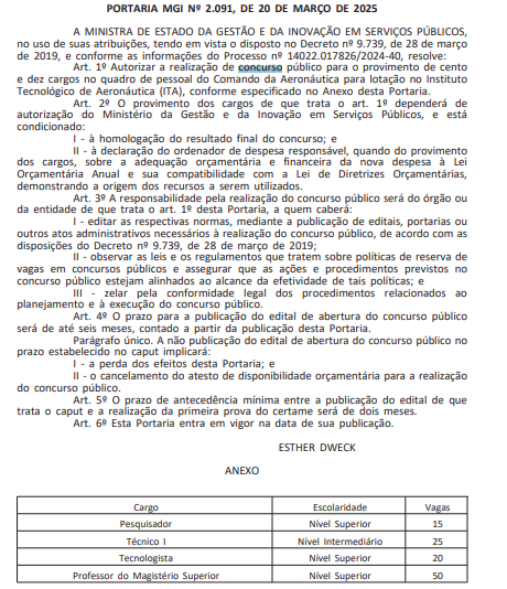 Um novo concurso ITA (Instituto Tecnológico de Aeronáutica) foi autorizado pelo Ministério da Gestão e Inovação (MGI)!