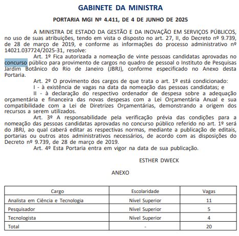 Está autorizada a nomeação dos aprovados no último concurso Jardim Botânico RJ por parte do Ministério da Gestão e Inovação (MGI)!