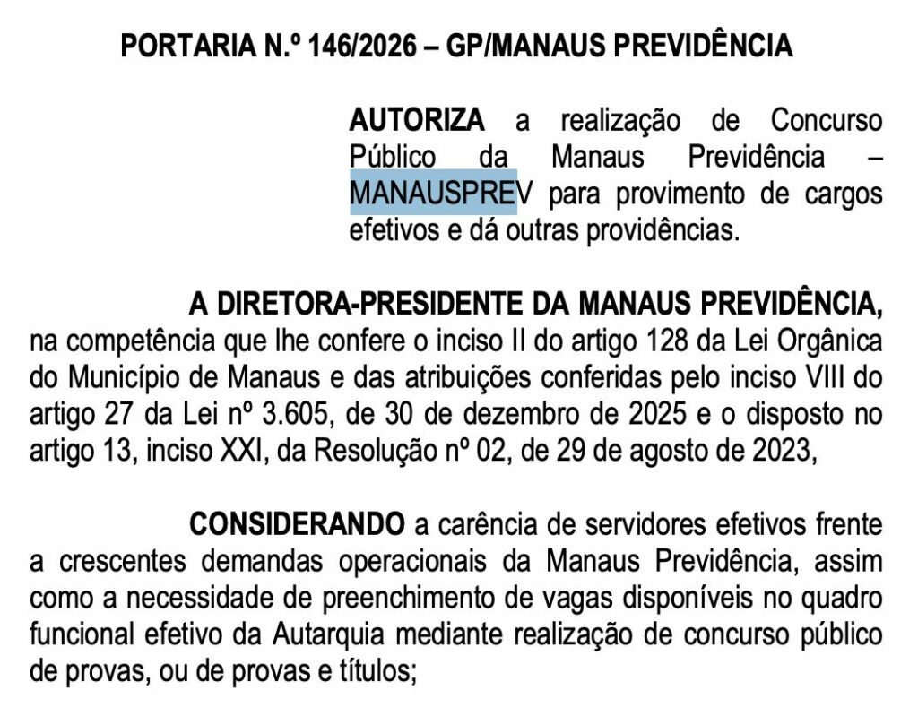 A autorização considera a carência de servidores efetivos diante das crescentes demandas operacionais da Manaus Previdência, além da necessidade de preenchimento de vagas disponíveis no quadro funcional efetivo da autarquia.