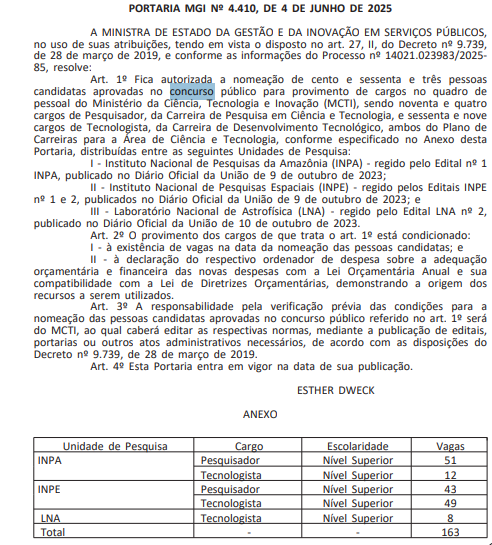 A portaria que autoriza a nomeação dos novos servidores foi publicada em Diário Oficial da União nesta sexta-feira (6/6). De acordo com o documento, são autorizadas, ao todo, 163 vagas, sendo 94 cargos de Pesquisador e 69 cargos de Tecnologista para as unidades de pesquisa seguintes: