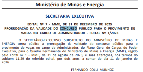 Foi publicada no Diário Oficial da União desta segunda-feira (5/1) a prorrogação da validade do último concurso público do Ministério de Minas e Energia (MME) para o cargo de Administrador.