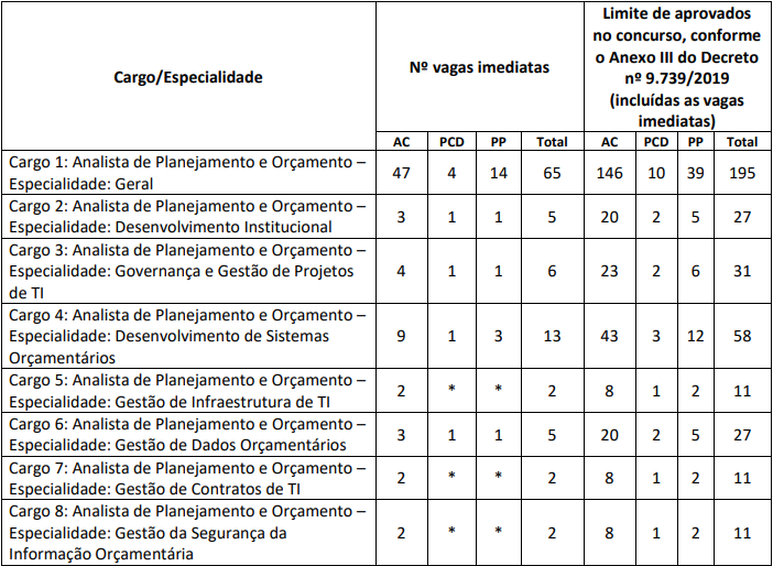 Publicado em janeiro de 2024, o concurso MPO ofertou 100 vagas para Analista de Planejamento e Orçamento, em diversas especialidades. O salário inicial é de R$ 20.924,80.