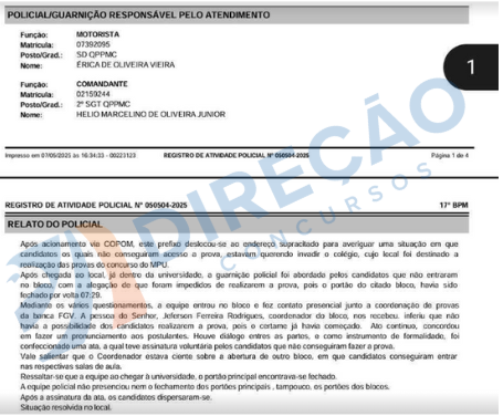 Com isso, a PMDF adentrou ao bloco e fez contato com a coordenação de provas da Fundação Getúlio Vargas. O coordenador do bloco informou que não havia possibilidade deles entrarem, pois as provas já teriam começado. No entanto, o mesmo informou estar ciente sobre a abertura de outro bloco, onde os candidatos conseguiram entrar no local.