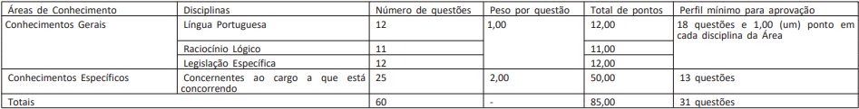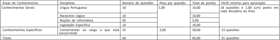 - Para cargos em geral (Exceto TI): A prova é dividida em Conhecimentos Gerais (Língua Portuguesa – 10 questões, Raciocínio Lógico – 10, Noções de Informática – 5 e Legislação Específica – 10) e Conhecimentos Específicos (25 questões).
