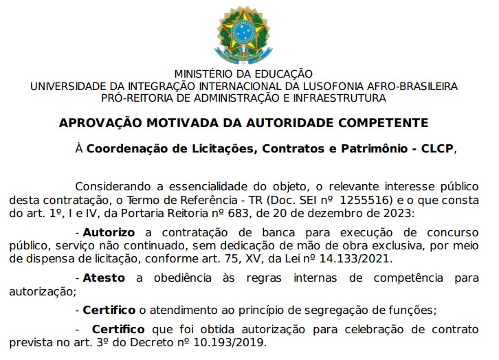 Foi publicado no Portal Nacional de Contratações Públicas, ato que autoriza a contratação do Idecan como responsável pela seleção.