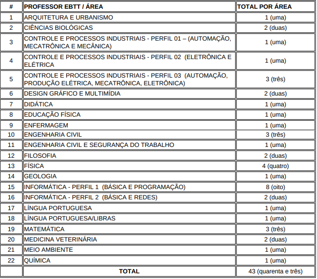 Serão ofertadas 52 vagas para cargos técnicos-administrativos em educação e 43 vagas para professor do ensino básico, técnico e tecnológico.