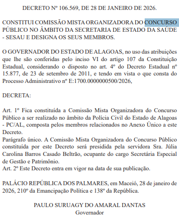 Foi publicada no Diário Oficial do estado, nesta quinta-feira (29/1), a constituição da Comissão Mista Organizadora responsável pela elaboração e condução do certame. O decreto (nº 106.569/2026) que formaliza a criação da comissão foi assinado pelo governador Paulo Dantas.