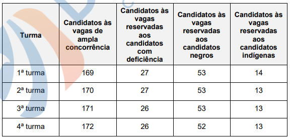 Após aprovação nas etapas Exame de saúde, Exame Psicotécnico e Investigação criminal e social, os candidatos serão convocados para o curso de formação do concurso PC ES. Serão convocados os candidatos dentro do quantitativo abaixo: