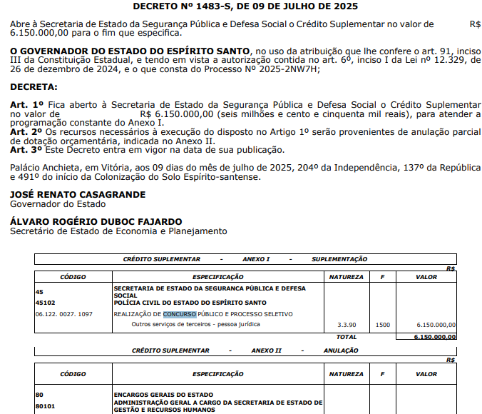 De acordo com decreto publicado em Diário Oficial do estado nesta quinta-feira (10/7), fica aberto à Secretaria de Estado da Segurança Pública e Defesa Social o crédito suplementar no valor de R$ 6.150.000,00.