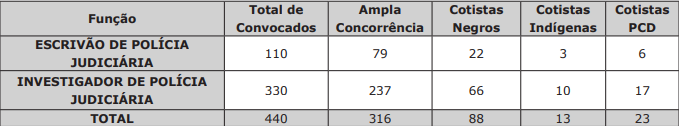 A convocação dos candidatos para a matrícula no Curso de Formação Policial, observará, rigorosamente, a ordem estabelecida na Classificação Preliminar e os seguintes quantitativos elencados no quadro abaixo: