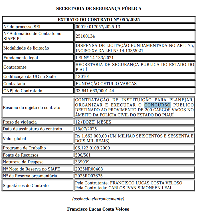 O extrato de contrato que oficializa a Fundação Getúlio Vargas (FGV) como banca responsável pelo concurso foi publicado em Diário Oficial do estado na última terça-feira (29/7).