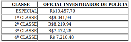 De acordo com o lei sancionada, os aprovados no concurso PC PI para Oficial Investigador receberão o salário inicial de R$ 7.210,48. Confira a tabela de evolução remuneratória abaixo: