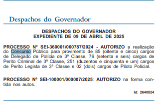 Como noticiado anteriormente pelo Direção, o certame foi anunciado pelo governador Cláudio Castro na última quarta-feira (9/4), e a autorização foi publicada em Diário Oficial do estado neste 10 de abril.