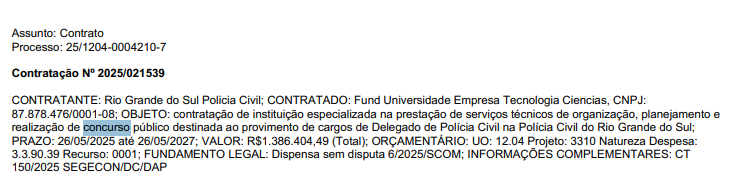Isso porque foi publicado em Diário Oficial do estado nesta segunda-feira (26/5), extrato de contrato que oficializa a Fundatec como banca organizadora do certame.