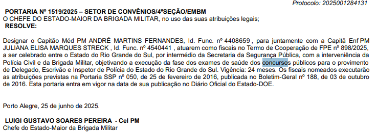 Nesta quinta-feira (26/6), foi publicada a designação de dois servidores para atuarem como fiscais no Termo de Cooperação com o objetivo da realização da etapa de exame de saúde no edital para os cargos de Delegado, Escrivão e Inspetor de Polícia do Estado do Rio Grande do Sul.