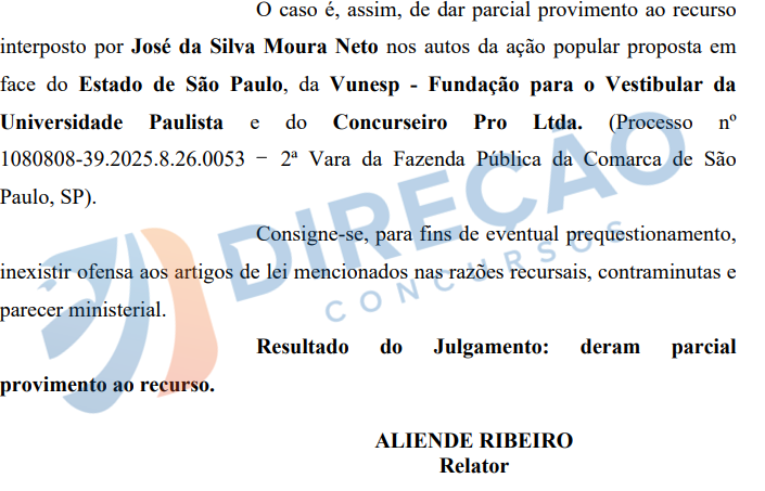 Em nova fase do processo judicial, em discussão no Tribunal de Justiça de São Paulo, o relator Aliende Ribeiro acolheu parte do recurso apresentado por denunciantes. A decisão diz respeito a solicitação de abstenção do estado de São Paulo em proceder com a homologação do resultado do concurso.