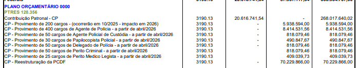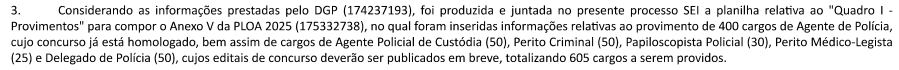 É importante destacar que os 400 cargos de Agente de Polícia aguardam apenas nomeação, tendo em vista que o concurso já está homologado. Além disso, para o cargo, há previsão de nomeação de 200 servidores até outubro de 2025, com impacto orçamentário no ano que vem.