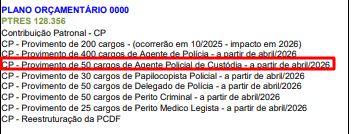 De acordo com a Proposta do Plano Orçamentário Anual em 2026 (PLOA) a previsão é de que 805 cargos na PCDF sejam providos até o ano de 2026, destes, 50 são para Agente de Custódia a partir de abril/2026, como é possível ver no trecho abaixo: