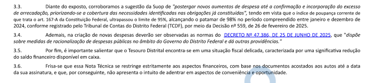 Isso porque o Subsecretário do Tesouro, Fabrício de Oliveira Barros, na última quarta-feira (2/7), enviou uma nota técnica à Secretaria Executiva de Finanças, Orçamento e Planejamento que corrobora com a sugestão da Superintendência de Operações de “postergar novos aumentos de despesas”.