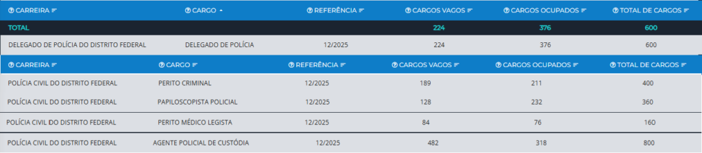 De acordo com os dados referentes a dezembro de 2025, a carência de servidores atinge diversas especialidades, o que reforça a urgência na realização do concurso PCDF. O cargo de Agente de Custódia é o que apresenta o maior déficit absoluto, com 482 postos desocupados para um total de 800 previstos em lei.