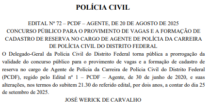A Polícia Civil do Distrito Federal (PCDF) prorrogou por mais dois anos a validade do último edital do concurso para Agente de Polícia!