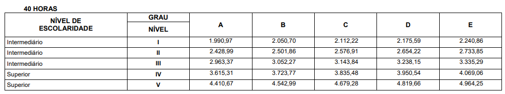 Conforme a tabela de evolução remuneratória para a jornada de 40 horas, um servidor que inicia no Grau A, Nível I (R$ 1.990,97), pode avançar até o Grau E do mesmo nível, chegando a R$ 2.240,86. Com a progressão para níveis superiores, a remuneração bruta inicial sobe para R$ 3.615,31 e pode chegar a R$ 4.069,06 no Grau E.