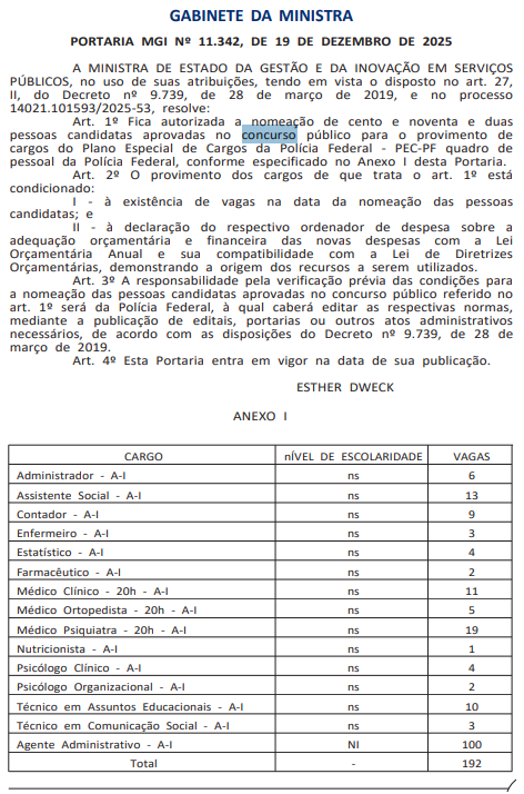 Foi publicada nesta segunda-feira (22/12), em Diário Oficial da União, a Portaria MGI nº 11.342, que autoriza a nomeação de 192 aprovados no concurso da Polícia Federal para cargos administrativos (concurso PF Administrativo)!